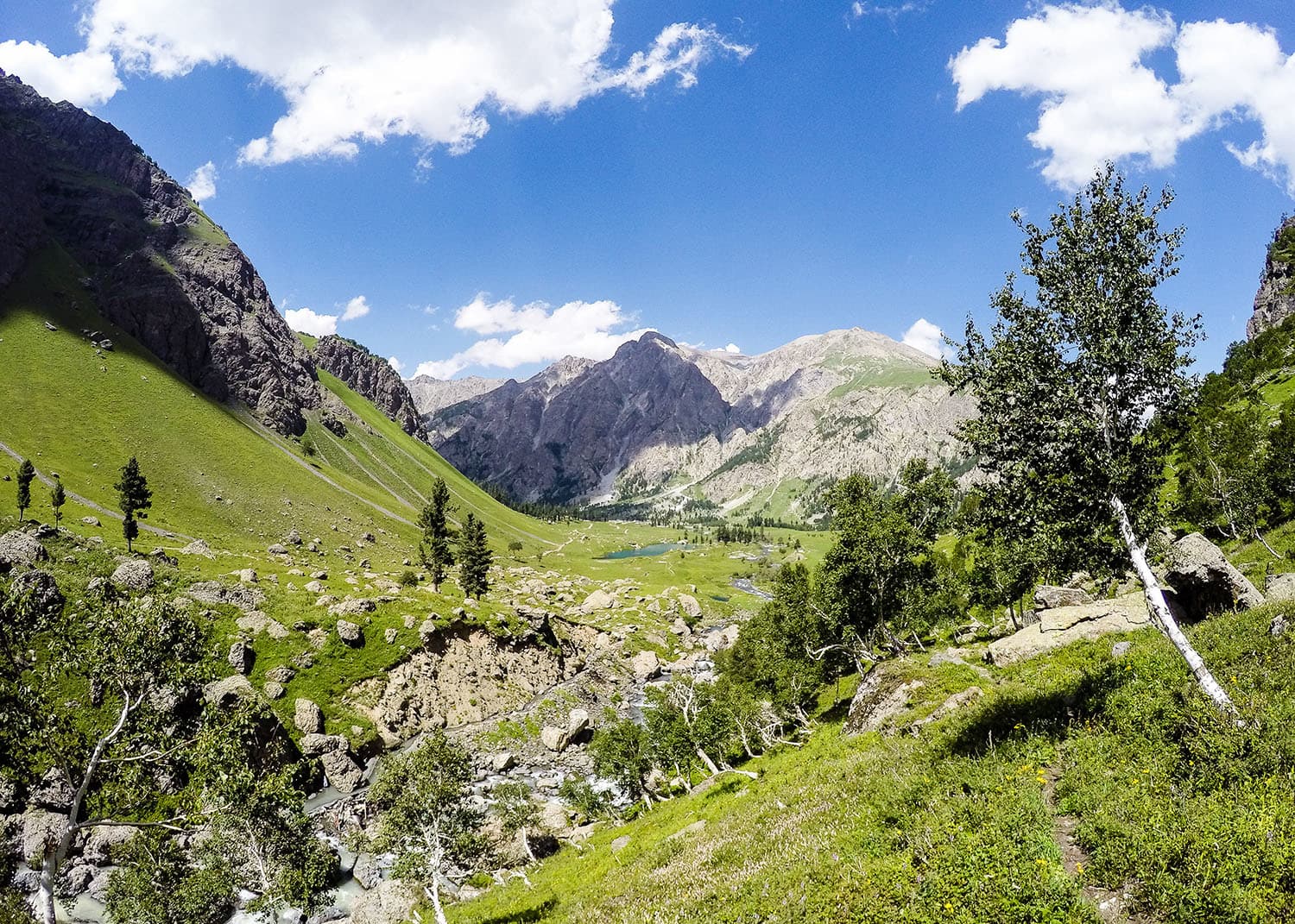 As we descend further, the scenery shifts dramatically. The towering peaks grow smaller, replaced by rolling green meadows. The track winds along a sparkling stream that seems to guide us forward.