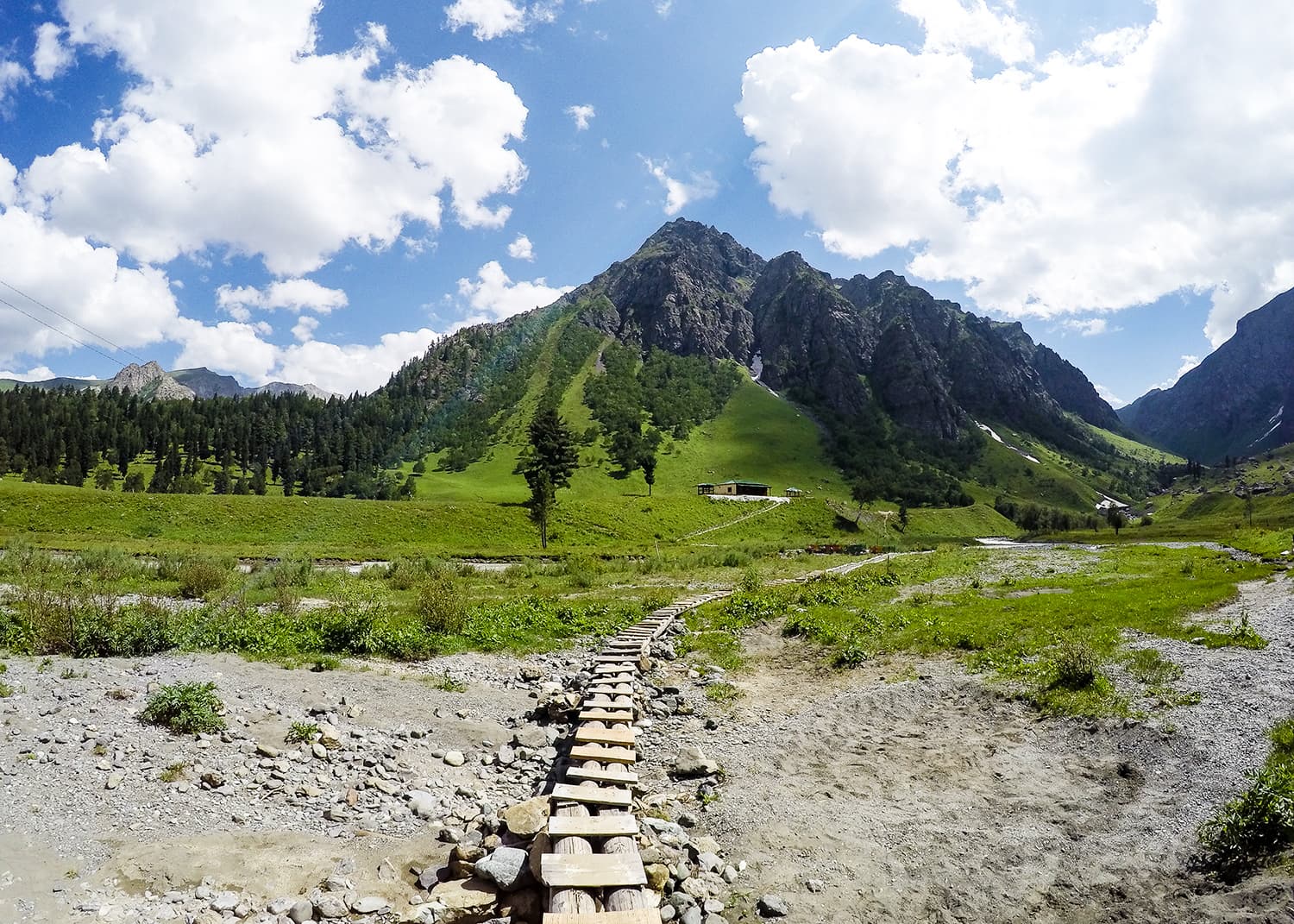The descent from Burzil Top is even more beautiful than the climb. Streams of glacial water run alongside us, and as we lose altitude, green pastures reappear. The snow melts away, revealing wildflowers, small wooden huts, and grazing cattle.