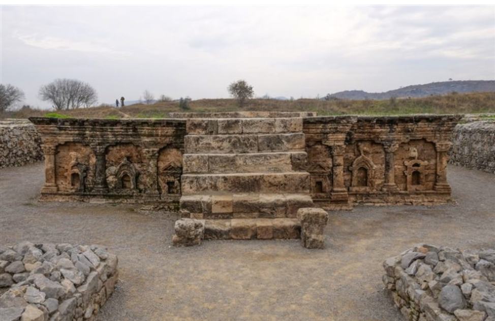 Sirkap’s ruins reveal a cosmopolitan society where Greek, Indian, Scythian, and Parthian influences coexisted. Excavations have uncovered residential quarters, temples, stupas, and marketplaces, each reflecting a blend of artistic and cultural traditions. One of the most iconic structures is the Double-Headed Eagle Stupa, a unique monument that combines Buddhist symbolism with Hellenistic motifs. The stupa features a double-headed eagle flanked by lions and elephants—an emblem that likely represented power, protection, and spiritual transcendence.